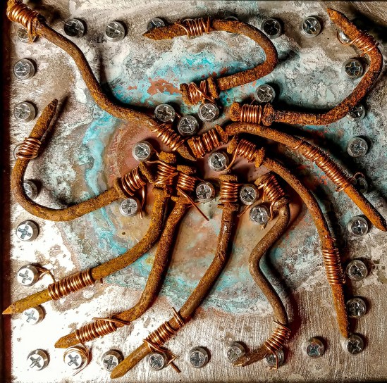 Iron Tick Posted by apxitekt on 2018/11/24 Nails, copper wire and zinc-coated screws on abraded zinc-coated copper sheet with patina. 6”x6” From DVAA 2018 Art in Sixes show Like Loading... Related